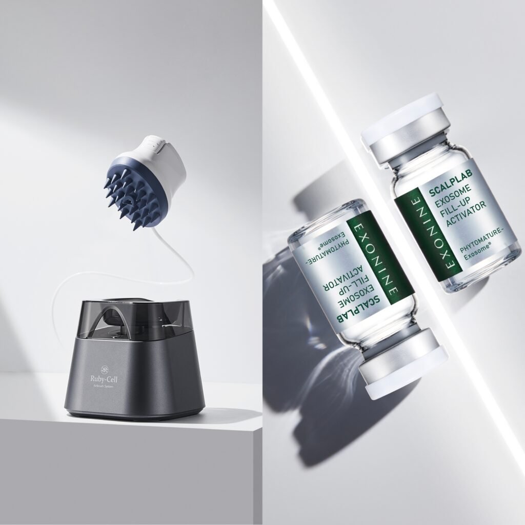 Le rituel Exonine Scalplab représente une innovation Beauty Tech dans le domaine des soins capillaires, visant à prévenir la perte des cheveux tout en revitalisant et renforçant les racines ainsi que le cuir chevelu. Celui-ci est composé de deux produits, un shampooing et une ampoule Active Fill Up formulés avec une multitude d’actifs. Ces formules bénéficient de l’amplification de leur efficacité grâce à la technologie Airbrush de Ruby-Cell et son applicateur brosse stimulante.