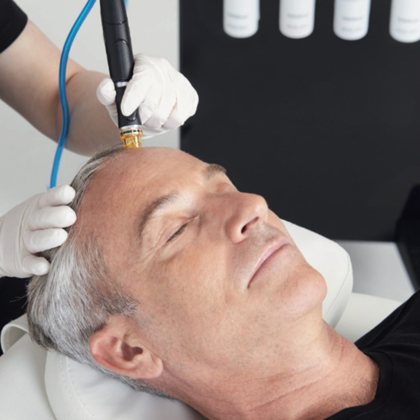Ce traitement nettoie le cuir chevelu grâce au programme Keravive Hydrafacial®, suivi d’une brumisation d’ampoule enrichie en cellules souches d’exosomes.